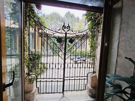 Sal a través de preciosas puertas de artesanales de forja antigua sales para escuchar el sonido de cada gota de agua como construyen notas musicales de tranquilidad que te atraen a encontrar maravilloso patio central. Precioso salir al corazón energético de la casa en libertad y mucha paz.