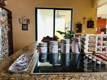 -Cocina con carpintería, Parrilla eléctrica, isla y ventanal vista al jardín