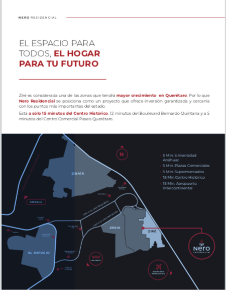 Zire es considerada una de las zonas que tendra mayor crecimiento en Queretaro. Por lo que Nero Residencial se posiciona como un proyecto que ofrece inversion garantizada y cercania con los puntos mas importantes del estado.