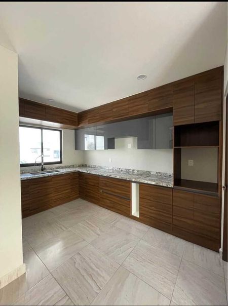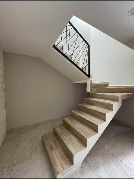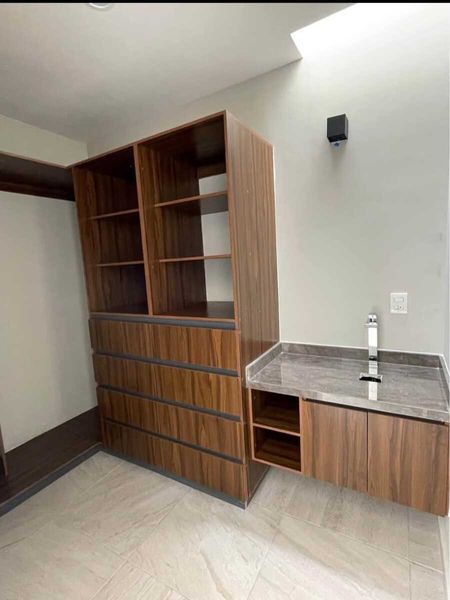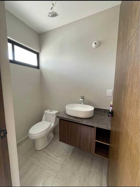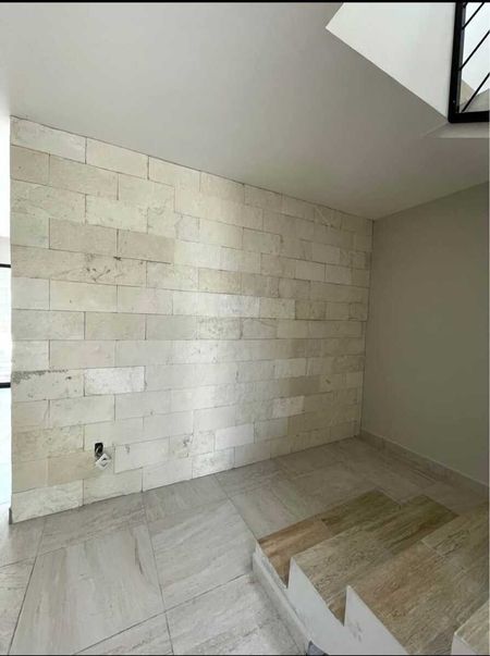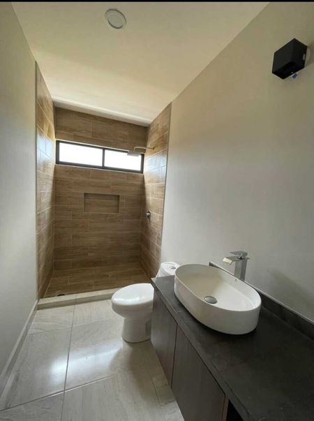 Muebles de baño con cubierta de mármol travertino, ovalín de sobreponer y monomando