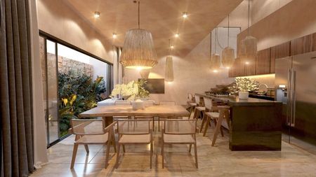 Primer nivel: Cochera para dos autos, bodega de servicio, medio baño de visitas,cocina, sala-comedor, jardín.