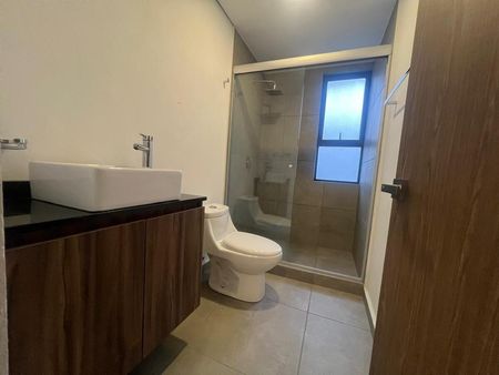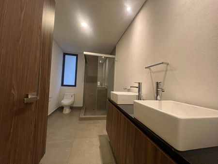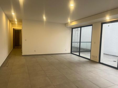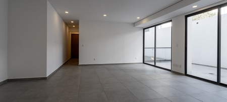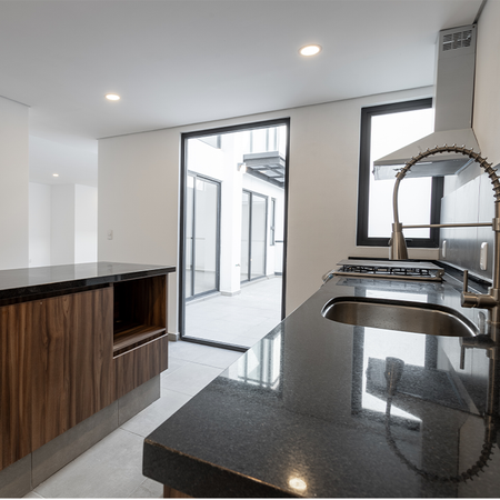 Departamento nuevo con patio interior de 24.6 m2, cuenta un espacio muy amplio para sala, comedor y espacio de sala tv, con ventanales de piso a techo hacia el patio/terraza, cocina integral equipada con vista al patio, área de lavado, 2 recámaras, la principal con vestidor y baño completo, un baño completo adicional, y medio baño en área social, 2 estacionamientos y 1 bodega en área de estacionamiento