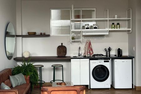Te recibe una sala a doble altura, iluminada naturalmente gracias a sus ventanas. La cocina está totalmente equipada, con alacena y una vista espectacular al patio.